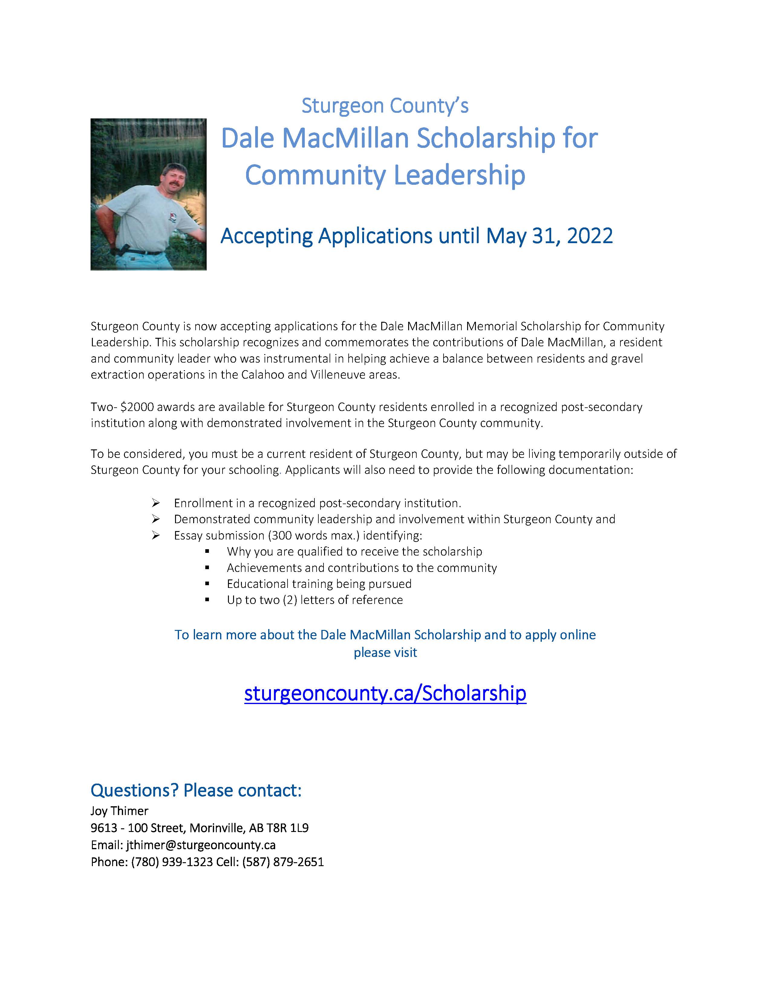 Sturgeon County's Dale MacMillan Scholarship for Community Leadership